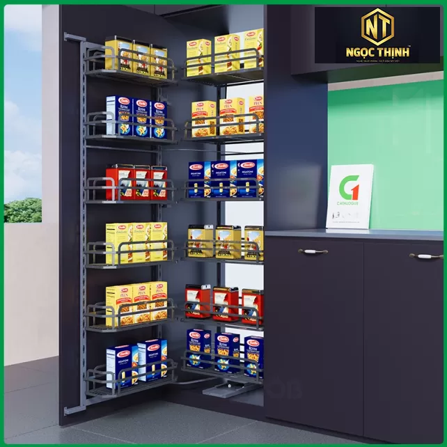 Kệ được thiết kế nhiều tầng với kích thước linh hoạt, phù hợp để lưu trữ các loại đồ khô như gia vị, mì gói, và đồ hộp, giúp tiết kiệm không gian tối đa.