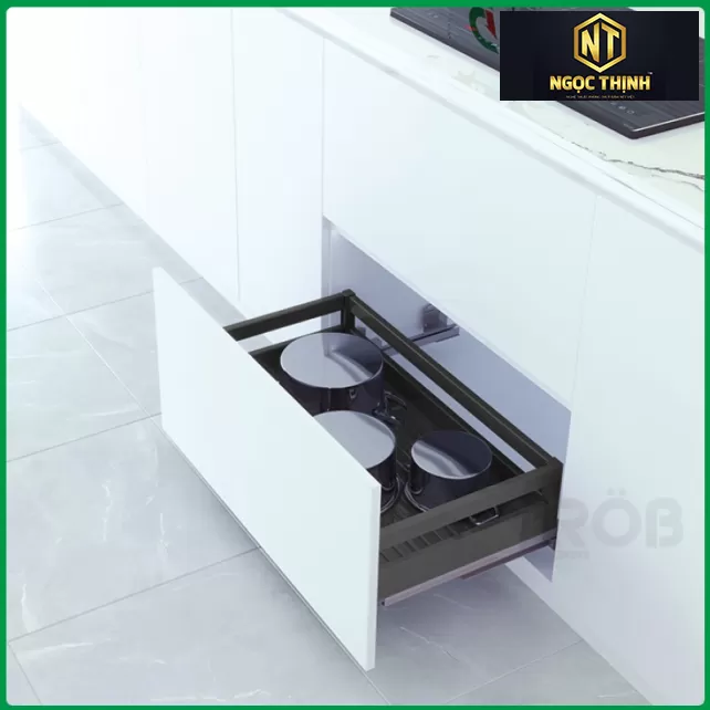 Để mang đến chuyển động kéo ra kéo vào nhẹ nhàng, kệ được trang bị hệ thống giảm chấn giúp ngăn kéo tự khít vào khi đẩy nhẹ, giảm chấn động. Điều này giúp tránh được hiện tượng xoong nồi bị xô đẩy, va chạm vào nhau khi kéo, mở tủ.