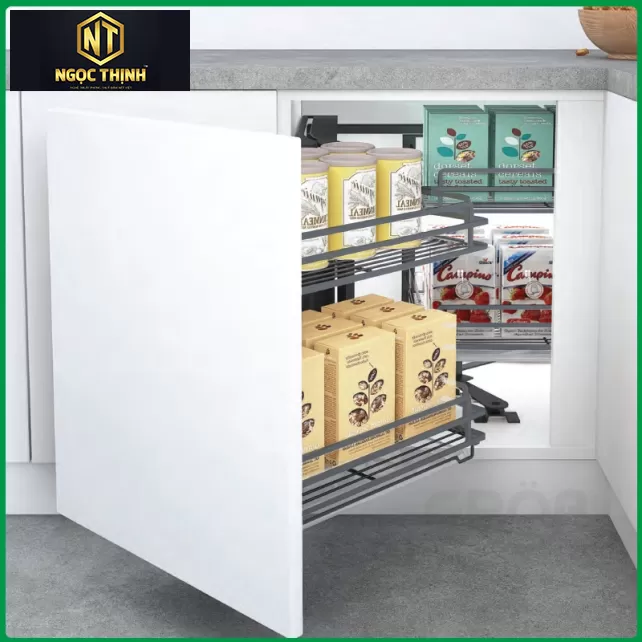 • Kệ góc liên hoàn tận dụng không gian góc tủ bếp, giúp lưu trữ xoong nồi, chảo và các dụng cụ nấu ăn lớn một cách ngăn nắp, dễ lấy khi cần.