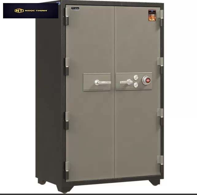 Két đứng hai cánh mở có 2 khóa chìa, 1 khóa mã và 2 tay nắm.Có 3 đợt di động và 1 ngăn kéo. Bánh xe sắt di chuyển.Két có tính năng chống cháy và bảo mật cao.