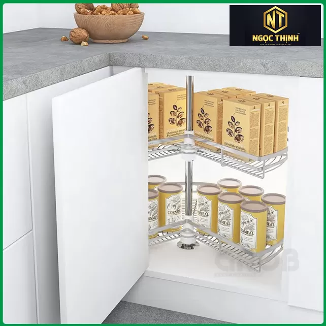 Tận dụng tối đa không gian góc tủ: Mâm xoay 270 độ giúp biến không gian góc khó sử dụng thành khu vực lưu trữ tiện lợi, cho phép bạn dễ dàng tiếp cận mọi vật dụng trên kệ.