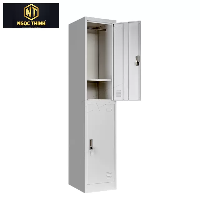 Tủ sắt sơn tĩnh điện 2 khoang cánh mở, bên trong mỗi khoang có 1 đợt cố định và 1 suốt treo quần áo.