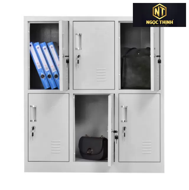 Tủ sắt sơn tĩnh điện 30 khoang cánh mở kính. Trên mỗi cánh có 1 khóa Locker, núm tay nắm và tai khóa móc.